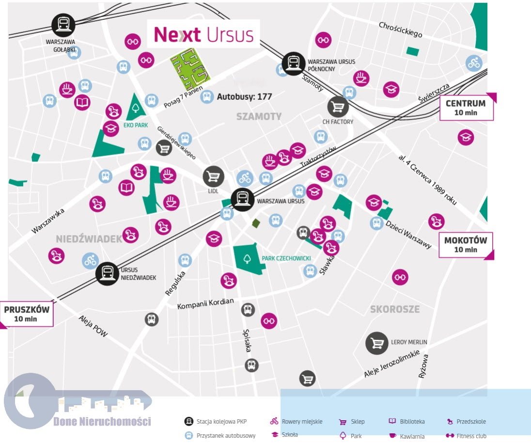 W pobliżu znajdują się przystanki komunikacji miejskiej, stacje KM Warszawa Ursus Północny i SKM Warszawa Ursus, którymi szybko można dostać się do centrum miasta, centrum biznesowego na Służewcu, czy np.lotniska , a w najbliższej przyszłości znajdować się tam będzie także stacja metro z parkingiem P+R.