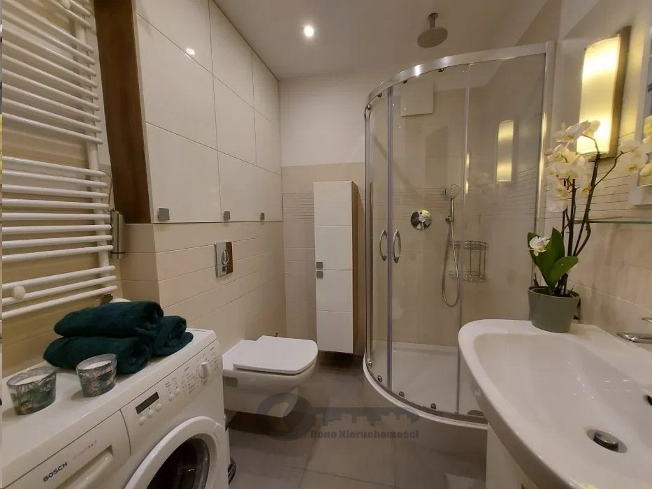 Przestronna łazienka z kabiną prysznicową, duża loggia.