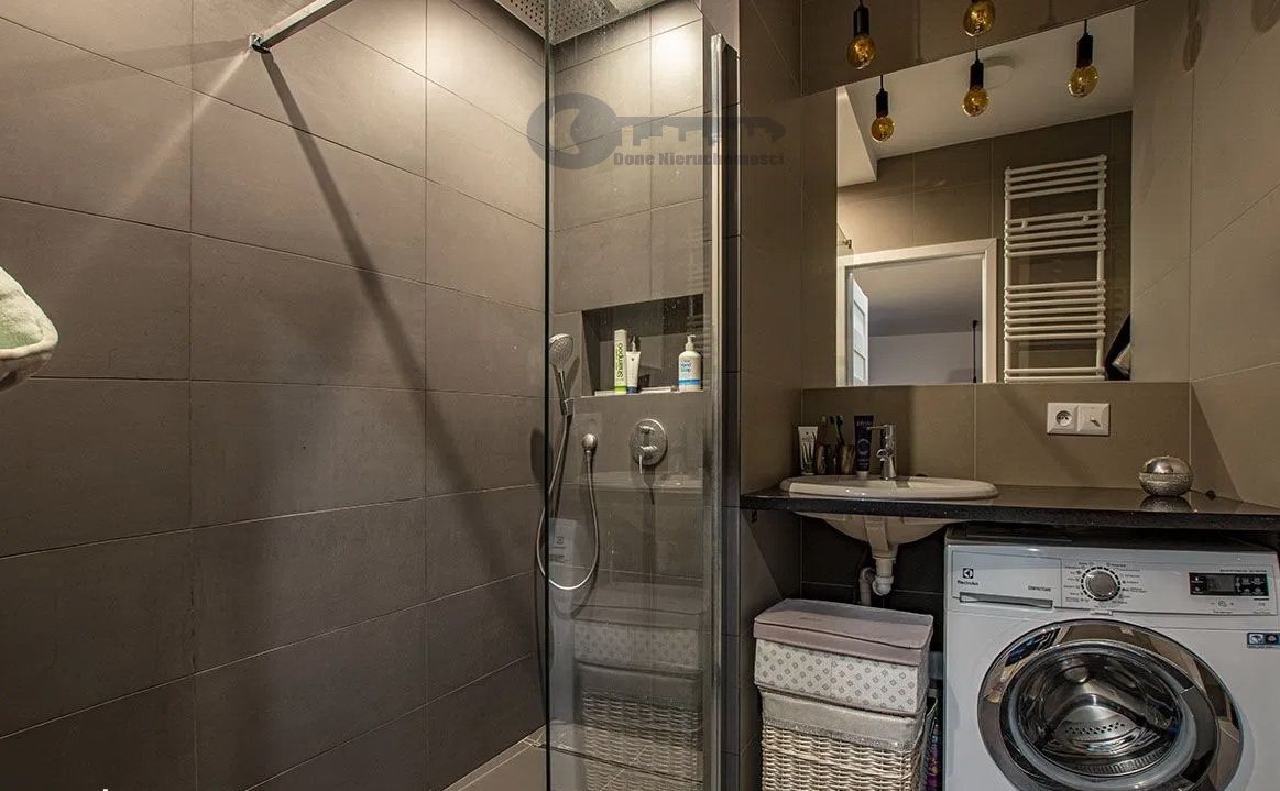 Przestronna łazienka z prysznicem z deszczownicą, duża loggia.